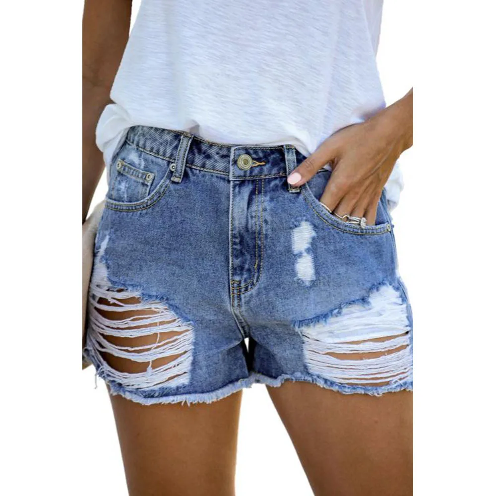 SEBOWEL 2020 New Summer Woman High Wiast Distressed Denim Shorts Medium Washed Broken Holes Short Jeans Female Casual Shorts