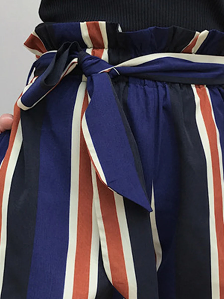 | Women Striped Chiffon Wide-leg Short-pants Fashion Korean Loose High Waist Shorts Casual Lace up Shorts |